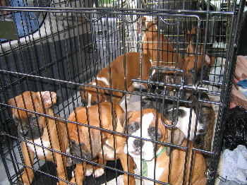 A Big SurpriseWe had gone on vacation to Gettysburg and were driving home when we saw something surprising. We had stopped at a rest-stop in rural Pennsylvania, looking across the parking lot, I saw a puppy and thought, "Huh! That's looks like a boxer puppy." I pointed it out to Charlie, just as someone opened a gate at the back of a van and a whole swarm of little boxer puppies jumped out and began romping on the grass. |