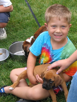 A Little PuppyCharlie and I walked over, met the owner, and began trying to help ride herd on the little puppies. They jumping and barking and looking for nasty things to get into in the grass. We tried to help keep them out of the parking lot and to pet them and love them up. Anyone who's seen one boxer puppy knows how irresistable they are, but the effect of multiple puppies is exponentially irresistable. Pretty soon we were all over there, sitting with them in the grass. I noticed that some of the little puppies had collars and some didn't. I pointed out one little female puppy to Daniel. We had been talking about getting another boxer, but hadn't taken any official steps to do so. Alisa and the kids fell in love with this little one almost instantly and began trying to persuade me to get her. (As if I needed to be persuaded to get a boxer puppy!) |