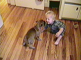 Daniel & PlatoDaniel is just ecstatic to have a doggie in the house. Plato is also excited to have someone who doesn't just tower over him. Plato clearly sees Daniel as someone special and warmed up to him instantly. Plato and Daniel are clearly going to be close companions. At the same time, however, Daniel also notices that people are paying attention to something other than him. He has some competition in the 'cute' department for the first time. We've been working hard to make sure that Daniel doesn't feel neglected.Plato particularly loves the little fuzzy ball in the picture behind Daniel and loves to catch and shake it. It was actually a children's toy from the Waldorf School that is supposed to be 'natural wool'. Our kids always hated it -- they just want toys like the ones you get from McDonalds. Plato obviously just has better taste. |