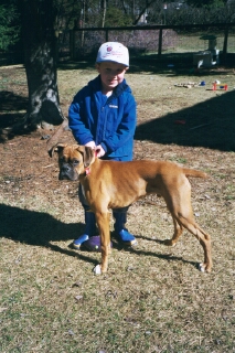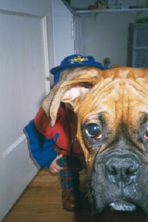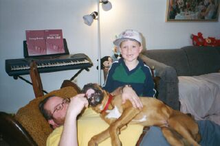 What a Ham!Plato can't resist getting into the picture. He gets along well with the kids, though he is sometimes overly enthusiastic and tends to knock them down when playing outside. Daniel can hold his own most of the time and has become very assertive with the dog. Sometimes Daniel is too assertive with Plato -- we actually spend more time protecting Plato from Daniel than the other way around nowadays.)Plato doesn't have a mean bone in his body and just wants to play. Alisa thought he was too nippy until we visted her father (who has a new dog that is 6 months older than Plato named Betsy). Betsy is very sweet, but has less experience with kids and wanted to nip them constantly -- not in a mean way, but still requiring constant supervision. Betsy also licked Daniel's head so much the first night we were there that Daniel's hair was all matted with dog saliva. To be fair, Daniel loved it and kissed Betsy full on the mouth at bedtime. |