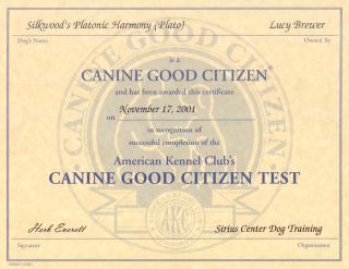 Citizen PlatoPlato has always minded me better than anyone else. Lucy (my mom) takes him for walks even more often than I do, but he has been less willing to take direction from her and sometimes jumps on her. Alisa and I finally talked her into taking him for obedience lessons. Plato was already pretty well behaved, but we hoped that he would be more likely to mind her if he was used to having her work with him. After several months of effort, they completed the course and they were given the opportunity to take the AKC Canine Good Citizenship Test. To Alisa's chagrin, he passed! Now Alisa is angling to get some video of him jumping on someone to try to get his citizenship revoked. |